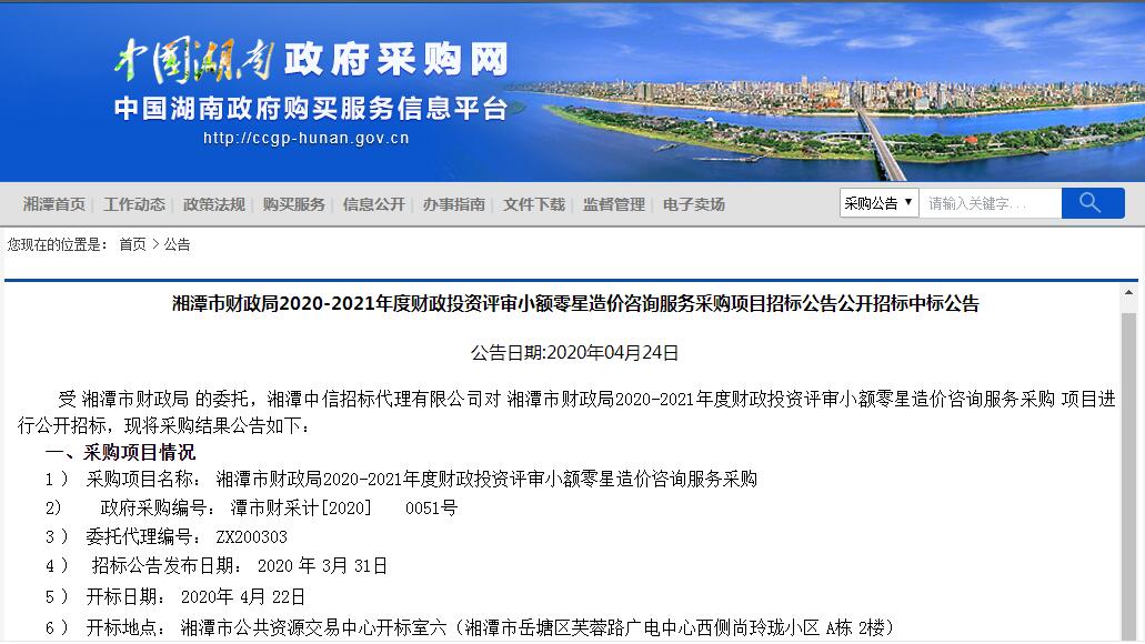 湘潭市財政局2020-2021年度財政投資評審小額零星造價咨詢服務采購項目招標公告公開招標中標公告