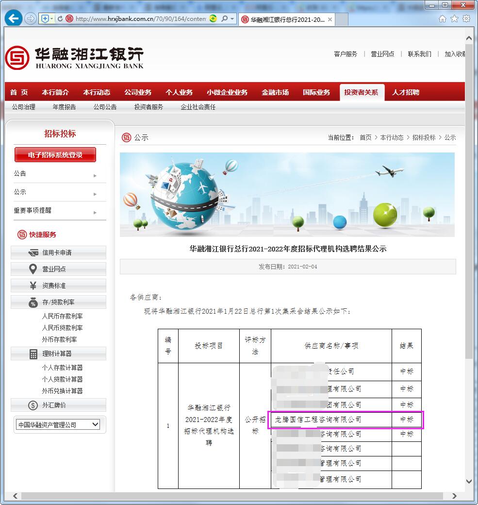 恭賀我司中標華融湘江銀行總行2021-2022年度招標代理機構(gòu)庫