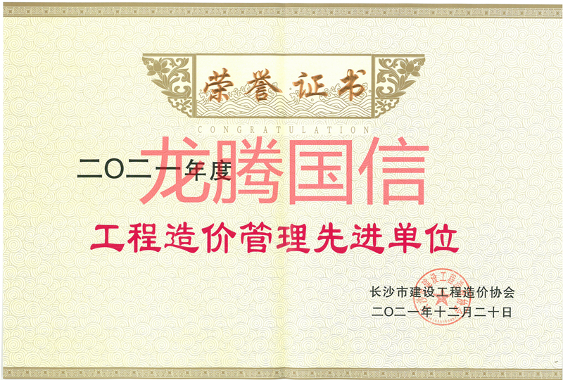 2021年,長(zhǎng)沙市建設(shè)工程造價(jià)協(xié)會(huì)在上級(jí)各部門(mén)的領(lǐng)導(dǎo)和指導(dǎo)下,經(jīng)全體會(huì)員的共同努力,我市工程造價(jià)行業(yè)發(fā)展穩(wěn)步推進(jìn),行業(yè)力量不斷凝聚,造價(jià)咨詢(xún)服務(wù)取得了新的成績(jī),涌現(xiàn)出一批成績(jī)顯著的單位,為表彰先進(jìn),決定授予“龍騰國(guó)信工程咨詢(xún)有限公司”“工程造價(jià)管理先進(jìn)單位”,并予以通報(bào)表彰。