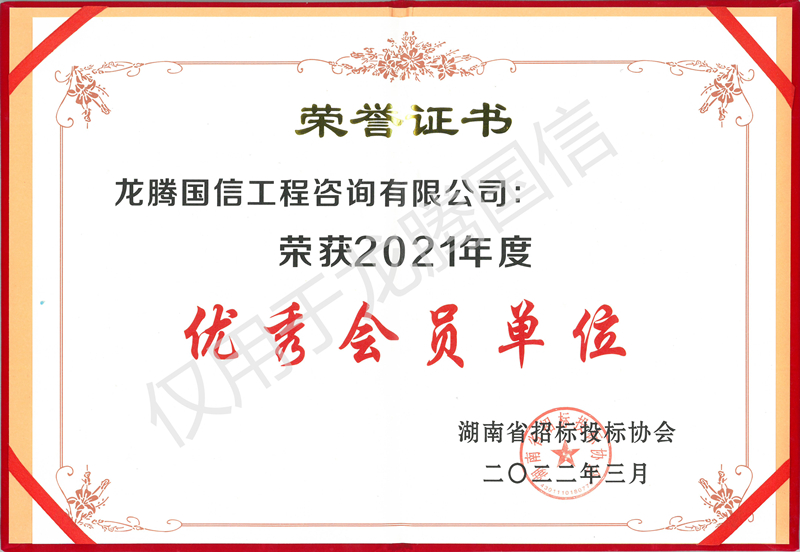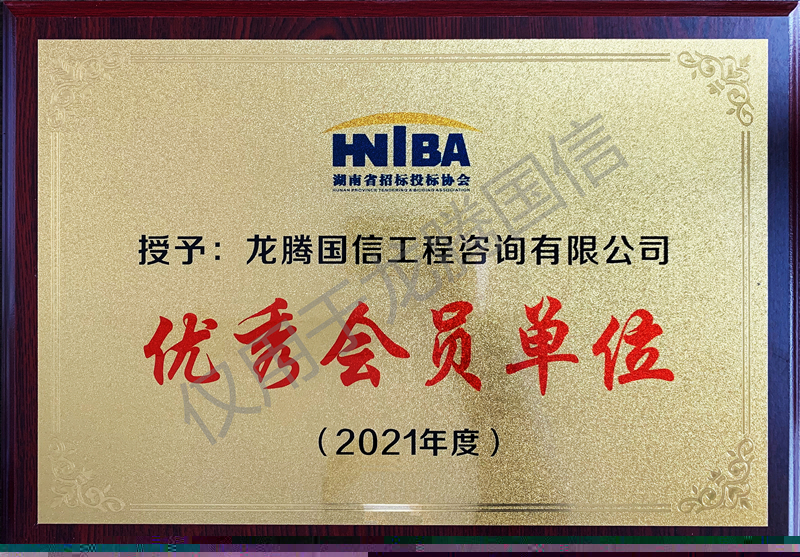 經(jīng)評審小組評審,龍騰國信工程咨詢有限公司榮獲湖南省招標(biāo)投標(biāo)協(xié)會2021年度“優(yōu)秀會員單位”榮譽(yù)稱號。