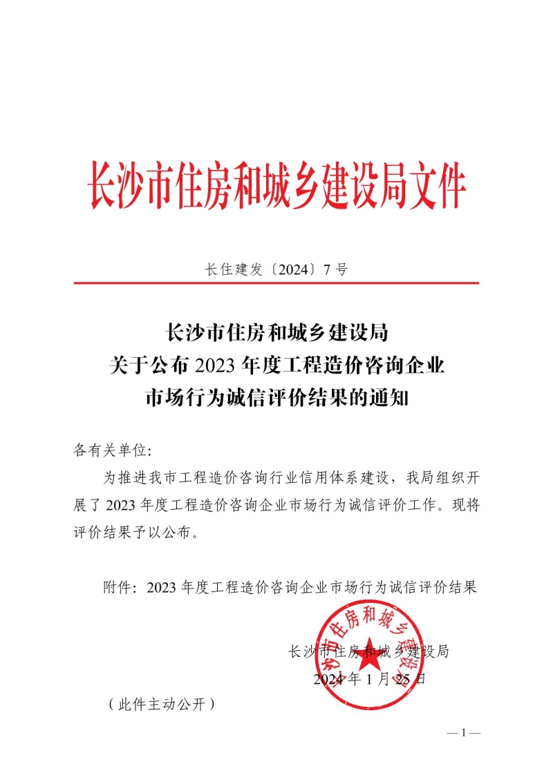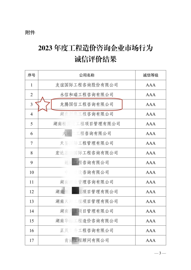 近日,長沙市住房和城鄉(xiāng)建設局公布了長沙市2023年度工程造價咨詢企業(yè)市場行為誠信評價結果的通知,我單位榮獲“工程造價咨詢企業(yè)誠信評價AAA”等級。