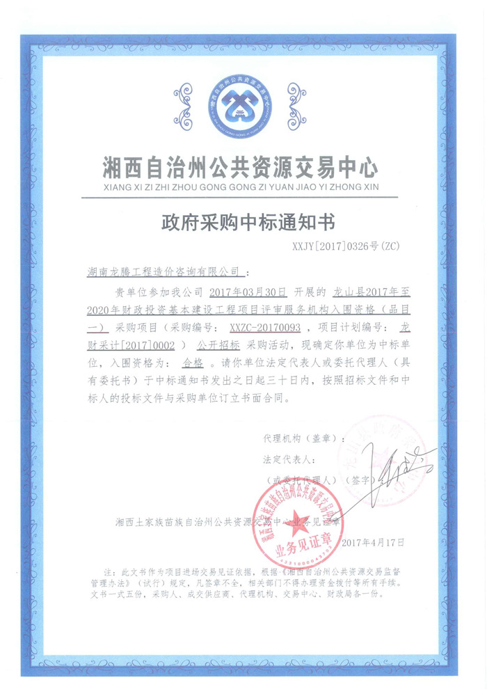 龍山縣財政局,對龍山縣財政投資評審中心聘用社會中介機構協(xié)評政府性投資項目進行國內公開招標。在此次公開招標活動中,通過公平、公開、公正的評比,我公司以優(yōu)異的成績獲得中標。