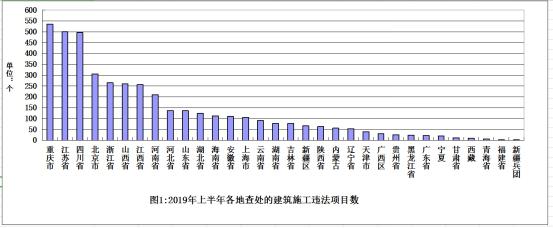 從各地查處的違法工程項目數(shù)量看,重慶、江蘇、四川3?。ㄊ校┎樘幜Χ容^大,分別查處項目535個、500個、496個(見圖1)。